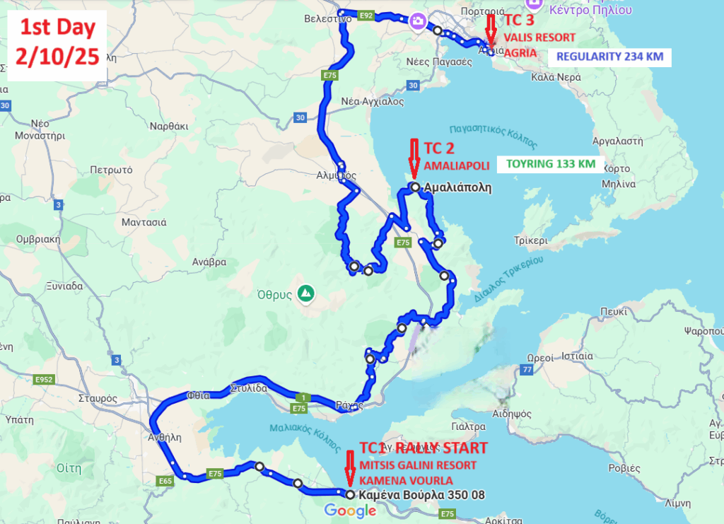 Η εκκίνηση θα δοθεί αύριο Πέμπτη 2 Οκτωβρίου στις 12.30’ το μεσημέρι από τον προαύλιο χώρο του ιερού ναού Αγίου Παντελεήμονα, στα Καμένα Βούρλα. Στη συνέχεια τα πληρώματα και των δύο κατηγοριών θα διέλθουν από, Θερμοπύλες, Πελασγία, Πτελεό, Νήες για να καταλήξουν στην Αμαλιάπολη που αποτελεί τον ερματισμό της πρώτης μέρας για τους συμμετέχοντες της κατηγορίας Touring.