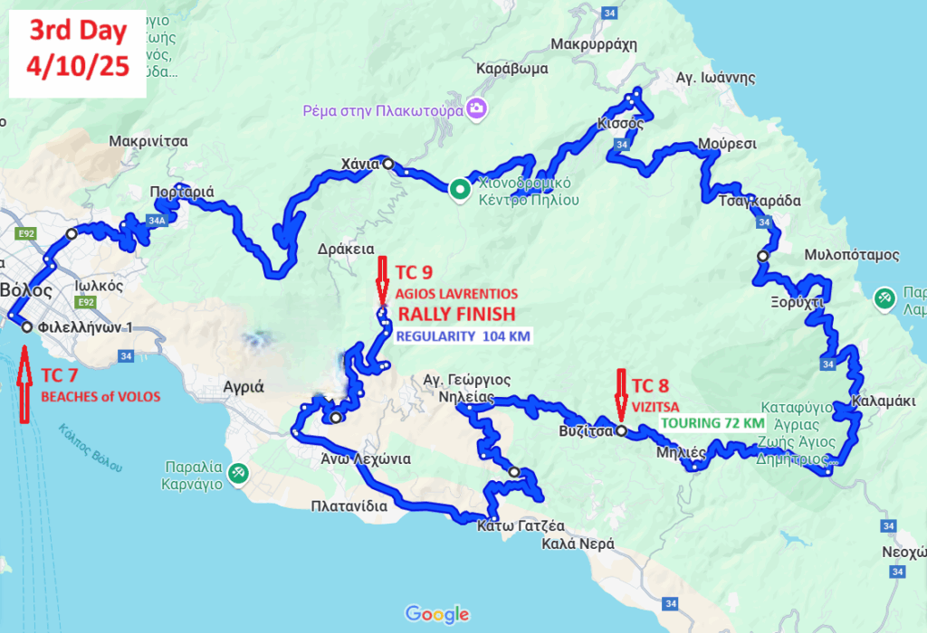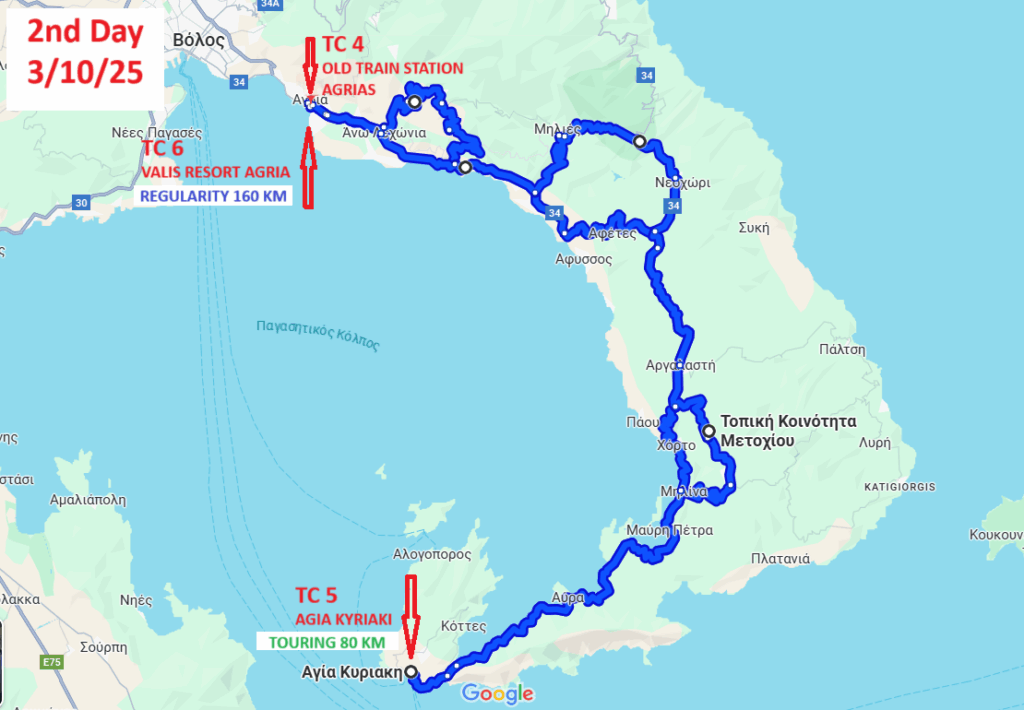 Το ίδιο σημείο αποτελεί ωστόσο και το χώρο ανασυγκρότησης για τα πληρώματα της κατηγορίας Classic Regularity, τα οποία στη συνέχεια θα κινηθούν σε εκπληκτικές διαδρομές στους πρόποδες του όρους Όθρυς και δια μέσου Αλμυρού και Βόλου θα τερματίσουν στο ξενοδοχείο Valis Hotel Resort στην Αγριά Βόλου, στο οποίο και θα καταλύσουν τα πληρώματα και των δύο κατηγοριών.