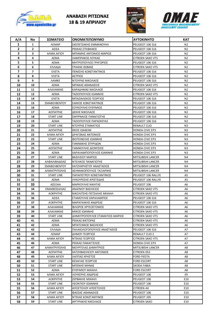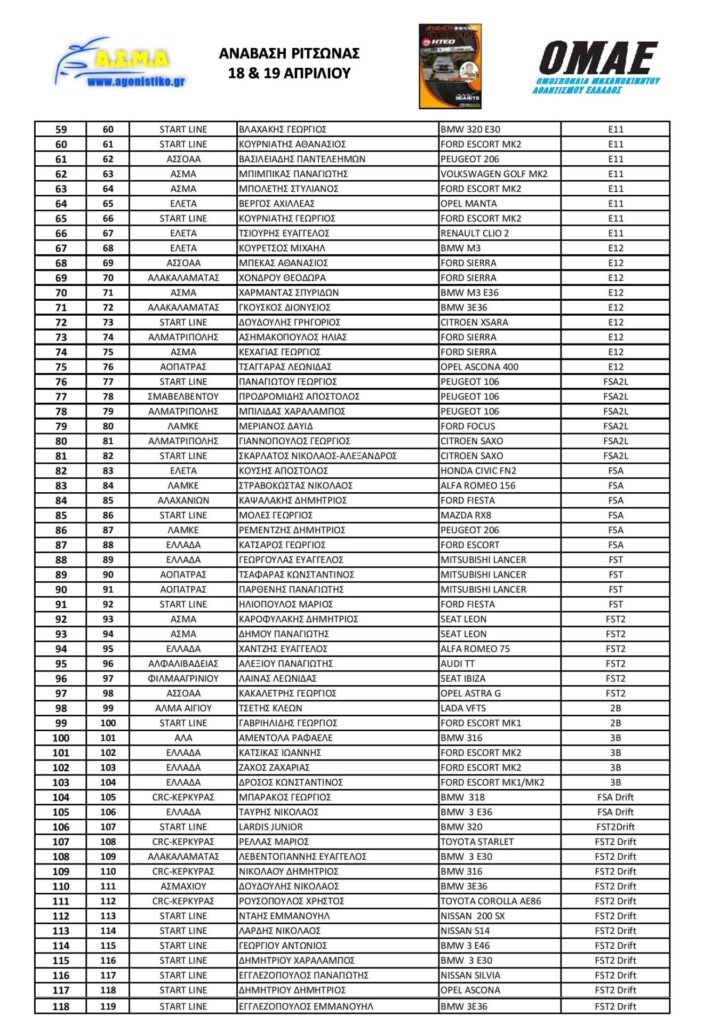 Όσον αφορά το πρόγραμμα της Ανάβασης Ριτσώνας, ο Διοικητικός και Τεχνικός Έλεγχος θα πραγματοποιηθεί την Παρασκευή 17 Απριλίου, από τις 17:30 έως τις 20:30, στο myKTEO Χαλκίδας, καθώς και το Σάββατο 18 Απριλίου στον χώρο των πιτς, από τις 08:00 έως τις 09:30.