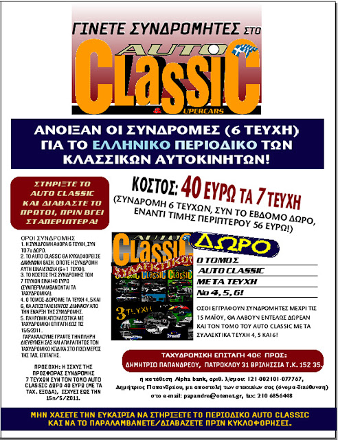Διαβάστε περισσότεραΜε λύπη και απογοήτευση είδαμε (και σας ανακοινώνουμε) ότι ο ρυθμός των συνδρομών για το περιοδικό Auto CLASSIC είναι εξαιρετικά…